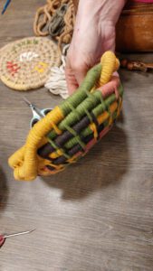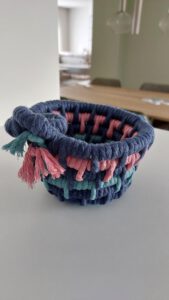 We hebben een mandje, onderzetter of wanddecoratie geweven met behulp van een dik koord en verschillende kleuren jute of katoenen dikke of dunne draden. Door deze draden op een unieke manier te draaien rondom het koord en in elkaar vast te steken ontstond een kleurrijk resultaat.